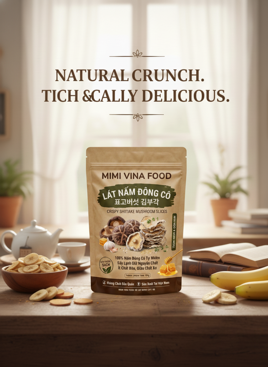 Sản phẩm Lát Nấm Đông Cô Bugak của MIMI VINA FOOD là sự kết hợp hoàn hảo giữa nguồn nấm đông cô tươi sạch tại Việt Nam và nghệ thuật chế biến Bugak truyền thống của Hàn Quốc. Từng lát nấm được tuyển chọn, tẩm một lớp bột nếp mỏng nhẹ rồi sấy giòn, giữ trọn hương vị nguyên bản và giá trị dinh dưỡng.